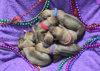 | Mardi Gras Rhodesian Ridgebacks and Ridgebacks by Kat proudly present the 8 beautiful babies born Mardi Gras Day (Fat Tuesday) February 28, 2017 from a breeding between AKC GrCH/Int'l Ch Mardi Gras C'est La Vie and AKC GrCH DC Toroa's Big Bang, SC |